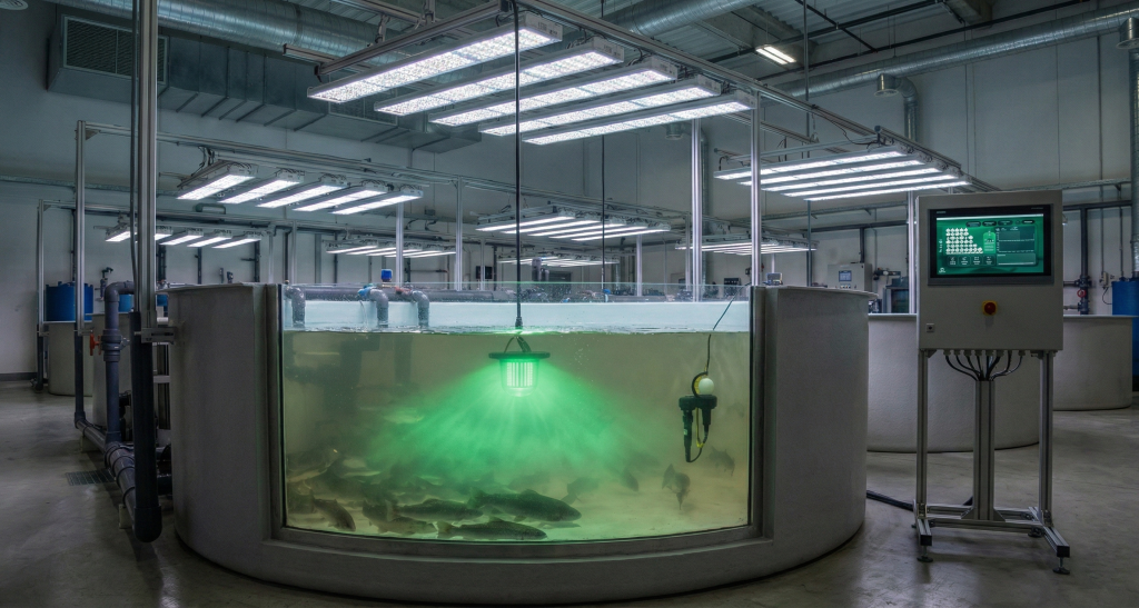 Especialmente en grandes estanques de cultivo en tierra, permite economizar energía eléctrica al suministrar solo la luz necesaria y mejorar el bienestar animal al evitar excesos o deficiencias lumínicas.